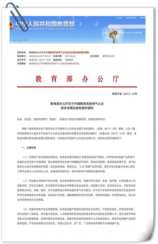 各地各校要結合實際,加強對學生宿舍、食堂、教學樓、禮堂等重點人員密集場所,實驗實訓基地、實驗室和實驗用品倉庫等重點危化品區域,校園施工現場、各類校辦企業、學校老舊房屋等重點單位,電梯、鍋爐、壓力容器等重點特種設備的電氣綜合整治。針對近幾年各校特別是高校學生宿舍存在的學生違規使用大功率電器、電動自行車充電、電器電路老化等安全隱患,采取有效措施,切實整治到位,防止安全風險隱患失控引發事故。